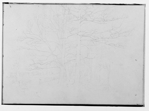This delicate graphite sketch of a country scene is by Thomas Hewes Hinckley, who worked in the 19th century. Hinckley, raised in a family of means, had the freedom to pursue a career in art. This sketch is of an uncultivated scene, trees and a glimpse of the horizon, but it speaks volumes about the cultural values of the time. Landscape art during the 1800s was often tied to ideas of national identity and expansion. Artists visually laid claim to territories, reflecting not just the beauty of nature, but also the socio-political drive to dominate and cultivate land, often at the expense of Indigenous populations and enslaved people. Hinckley’s work reflects an intimate engagement with nature, one that romanticizes a vision of pastoral life, while perhaps obscuring the complex histories embedded within the American landscape. This drawing invites us to reflect on the stories landscapes tell, and the untold stories they carry.