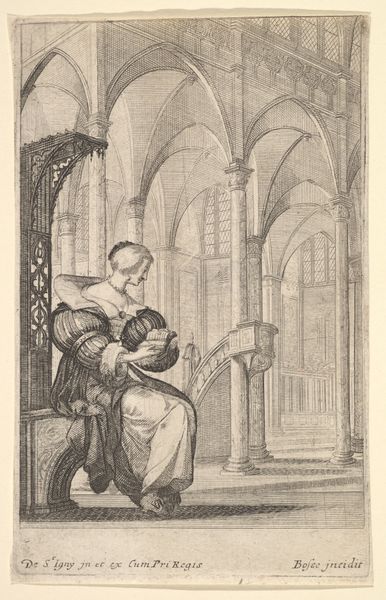 Editor: This engraving, "Galileo Galilei in zijn cel" by Carel Christiaan Antony Last, created before 1839, is rather evocative. The starkness of the cell is quite striking. What do you see as the most compelling elements in its composition? Curator: Formally, the stark contrast between light and shadow is immediately apparent. Observe how the artist manipulates chiaroscuro to guide our eye. The source of light, seemingly from a high window, illuminates Galileo's face and hands, drawing our attention to his intellectual pursuit even in confinement. Note, also, how the geometric structure of the cell, particularly the archways and the rigid lines of the stone, provide a sense of confinement that opposes the suggestion of illumination. Editor: So the geometric shapes add to the story through the visual language. It’s interesting how form and content intersect. Does the artist's choice of engraving affect the mood? Curator: Precisely. The precise lines and cross-hatching inherent in engraving contribute to the overall sense of detail, but simultaneously distance the viewer through its inherently graphic quality. It presents the scene with a degree of coolness and intellectual detachment. Consider how a different medium might have altered the emotional impact. Editor: That makes a lot of sense. The coolness you mentioned encourages closer inspection rather than immediate emotional reaction. I didn't consider how the choice of engraving has created this sense of detached observation. Curator: Indeed. The work's formal qualities ultimately determine its unique aesthetic effect. By isolating each, the effect becomes obvious, creating something wholly unique. Editor: Thinking about it now, breaking the image down like that makes understanding the meaning so much clearer! Curator: Understanding how line, light, and form come together to present us with something far grander is critical in understanding the value and message behind works like this.