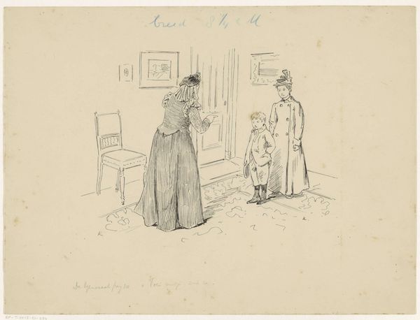 Editor: This is "Verkoper voor een deur," or "Vendor at a Door" by Langenus, probably created sometime between 1900 and 1930. It looks like it's an ink or pen drawing. It feels like a fleeting moment captured in someone's sketchbook. What story do you think it’s telling? Curator: Well, considering the era, the drawing offers a glimpse into the socio-economic hierarchy. The vendor, likely a working-class individual, stands outside the door, perhaps waiting for a sale. The maid, a symbol of domestic service, and the young girl represent the bourgeois family within. Editor: I see. So the interaction itself is charged with this class difference? Curator: Precisely. How does the artist visually convey this separation? Note the body language – the vendor seems almost hesitant, while the figures in the doorway possess an air of... what? Editor: Confidence, maybe? There's a stillness about them, like they're used to this dynamic. It feels a bit…unequal. Curator: Unequal is a crucial word. And how might that relate to contemporary discussions about labor and economic justice? Does this image provoke a conversation about access and opportunity? Editor: I think so. It makes you consider who has the power to buy and sell, and who's dependent on that exchange. It also feels very gendered with the women present at the transaction, it does prompt those types of questions on societal expectations and representation in commerce. Curator: Exactly. By exploring these historical depictions, we can begin to understand the deep roots of present-day inequalities. Thank you for this great question and insight! Editor: Thank you! I hadn't thought of it that way initially, but the social context really brings the drawing to life.