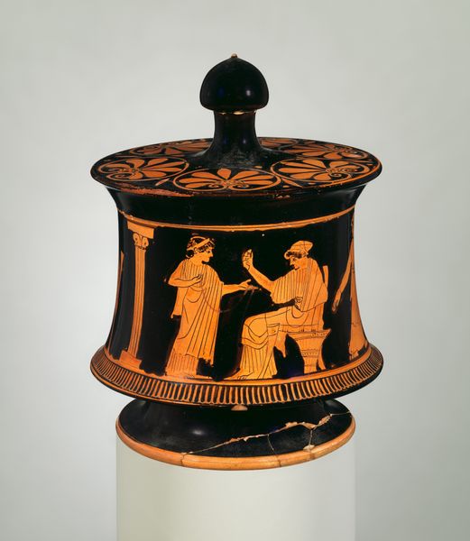 Editor: Here we have a *Pyxis*, dating back to around 450, now residing at The Art Institute of Chicago. It's made of ceramic. It looks like it depicts a story, perhaps a myth. What do you see in this piece, particularly regarding its historical and cultural relevance? Curator: Oh, this little container is far more intriguing than it lets on, isn't it? I imagine some wealthy Athenian woman tucked away her favorite trinkets in here. But, look closer. The narrative unfolding around its circumference is most likely a wedding scene involving Eros (that's him with the wings) and perhaps a fleeing bride, maybe even Persephone being spirited away by Hades. Does it make you wonder what kind of personal "objects" this container actually safeguarded? Something erotic, do you think, which connects this ceramic piece to secret rituals of marriage and feminine power in ancient Greece? What do you make of it? Editor: Wow, that adds a whole new layer! I was just thinking perfume or jewelry, but the "erotic" element…So, you're suggesting it wasn't just decorative? Curator: Oh, rarely ever JUST decorative! Everything, especially then, held layers of symbolism we often miss today. The choice to depict Eros in a wedding scene is loaded with meaning, don't you think? Consider, it was common as part of courtship gifts in Greek and Roman tradition, which can show a shift to romantic expression during the rise of more mature Greek drama. I imagine opening this and the scents emanating up created not just allure, but intimacy and commitment! Editor: That's so fascinating! I hadn’t considered that these objects might tell us about their romantic and social lives. Curator: Indeed. And, as for me, it whispers, even now, that love and desire have always been delightfully, wickedly complicated, hidden behind closed lids, just like this.