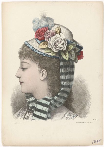 Editor: So, this is *Le Journal des Modistes*, a print from 1892 showing women's fashion. It has this kind of dreamlike quality, almost like an illustration from a fairytale, what do you make of this artwork? Curator: What immediately strikes me is the deliberate staging of these two profiles. They aren’t simply showcasing hats, they’re subtly projecting ideals of feminine allure in that period, consider the gazes and the posture - do they remind you of figures from other popular imagery from the time? Editor: I hadn't thought of that. Now that you mention it, it is similar to the romantic heroines that show up in other turn of the century images. Curator: Exactly. Note how the embellishments on the hats, like feathers and ribbons, amplify a sense of luxurious excess but at the same time serve to highlight an aspiration, a cultural fantasy. How do these elements function as symbols? Editor: They speak to wealth and status but they also show the fashion and taste of the time period. It is fascinating to consider that what was luxurious then might feel so different today! Curator: Precisely! And observe how the artist utilizes the delicate watercolor and detailed linework. Does the medium itself contribute to the dreamlike quality we spoke of earlier, creating a softened reality? Editor: Yes, the watercolor gives a gentle aura to the piece and makes it look timeless. It brings this intimate and graceful element. I see it now. Curator: Indeed. These aren't just pictures of hats, they’re reflections of societal dreams and ambitions, mirrored in the visual language of the era. Editor: It makes me see fashion plates in a different way, understanding that they're not just about garments, but about identity. Thanks so much for your expertise. Curator: My pleasure. Recognizing those embedded cultural meanings certainly enhances our appreciation, doesn't it?