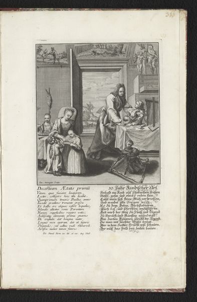 Editor: We’re looking at "Filippo Neri bekeert een joodse familie" created between 1630 and 1641 by Luca Ciamberlano, currently held at the Rijksmuseum. It's an engraving, with very fine line work. The composition strikes me as unusual, almost like a stage set with figures arranged in different planes. How do you interpret the stark divisions within the artwork? Curator: Indeed. Notice how the artist uses line and form to create a distinct spatial separation. The division isn’t merely representational; it serves as a crucial compositional device. The carefully balanced areas of light and shadow, and the precise linear perspective all contribute to a structured, almost architectural framework. Editor: I see what you mean. It’s not just about depicting a scene, but about how the different spaces interact visually. Curator: Precisely. Consider the lines that define the figures’ drapery and their arrangement in relation to each other. It builds up a complex interplay between masses, creating a measured cadence across the entire piece. It’s almost as if the content itself—the conversion—is secondary to the formal problem of organizing space and volume through line. Editor: So, are you suggesting that the artist's focus was less on narrative and more on pure aesthetic form? Curator: In this case, I believe a formalist interpretation opens valuable pathways for decoding Ciamberlano's choices. It's by examining the intrinsic visual properties of the work, the geometric framework and precise articulation, that we start to perceive how meaning is generated through purely formal elements. Editor: This close observation, detaching the image from history, teaches me new things. Thank you for providing this viewpoint! Curator: My pleasure! Analyzing artwork based on its pure aesthetic form reveals other dimensions, and this can lead to profound understanding.
