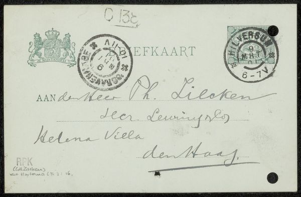 Editor: So, this is "Briefkaart aan Philip Zilcken," a postcard potentially created between 1900 and 1911 by Willem van Konijnenburg. It combines drawing, photography, and ink. It seems so ordinary, yet I feel like it’s hinting at something. What do you see in this seemingly simple piece of correspondence? Curator: I see echoes of connection. Notice the heraldic symbol, the lion rampant – a familiar emblem of national identity, used to publicly legitimise its administration. Then consider the stamp; not just an emblem of state, but a symbol of exchange, of something passed from one hand to another. It suggests shared experience, commerce, and shared social understanding. Editor: So, beyond just delivering a message, it's participating in cultural meaning? Curator: Precisely. Consider the postmarks, those official stamps marking time and place. They ground this little card in a specific moment. They act as tiny, almost ritualistic symbols validating its journey. Editor: It’s interesting to think of these small details – stamps, seals, handwriting – as part of a visual language we’re still deciphering today. Curator: Absolutely. These aren't just administrative necessities. They are vestiges of history, capturing individual human stories alongside collective cultural values. And even the act of handwriting speaks volumes – a unique imprint of the sender, a direct, intimate link across time. It asks, how does state symbology intersect the daily lives of its people? Editor: I hadn't thought about the personal touch of handwriting in that context before. This really puts a new spin on the meaning of "correspondence." Thank you. Curator: My pleasure. I hope it encourages visitors to appreciate how official and vernacular symbologies shape even our most personal communications.
