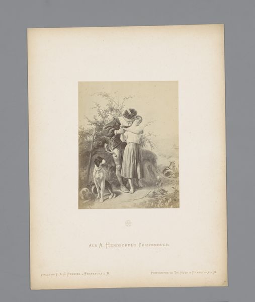 Editor: Here we have a photo reproduction of a sketch made before 1870 by Albert Hendschel, titled 'Fotoreproductie van een schets van een meisje dat bloemen plukt.' It appears to be a pencil drawing on paper with some kind of pale wash to it, maybe aged? How do you interpret this work? Curator: Given its historical context, consider the paper itself. Likely handmade, and perhaps reflecting a localized industry of paper production? What about the photographic reproduction of a drawing—how does that democratize art or change its mode of consumption in this period? Editor: That's interesting, the means of distribution I hadn’t considered. It speaks to a shift in who could access art… What else does that entail, in terms of consumption and readership of such images? Curator: This opens many potential interpretations. Hendschel's original sketch likely functioned as an intimate record, perhaps part of a personal journal as it is sketched ‘Aus A. Hendschel’s Skizzenbuch,’ then turned into a reproducible item for mass consumption. Does the shift from unique artwork to readily available reproduction affect our engagement with it? Are we meant to see a glimpse into Hendschel’s own view, or something else? Editor: I never thought about mass consumption of art in this time period! Thanks for opening my eyes to how artistic production changes how we interact with the image itself! Curator: It is the blending of art, reproduction technology, and economics of everyday life that really brings forth the artwork’s intrinsic, cultural meaning.