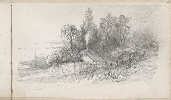 Curator: Before us we have John Constable's pencil sketch, "Evening (A Suffolk Cart)." Editor: There's a starkness to this that I wasn't expecting. It feels…almost melancholic, despite being a scene of rural England. Curator: Constable was deeply connected to the Suffolk countryside. The cart, the looming trees, they all speak to a slower, agrarian existence. Editor: Absolutely, but it's an existence that was already under threat in Constable's time. The industrial revolution was transforming England, and landscapes like this were disappearing. Perhaps that awareness adds to the emotional weight. Curator: It’s interesting how Constable uses the graphite. There's a lightness, an almost dreamlike quality. The marks capture light, shadow, and a sense of place. Editor: For me, the cart itself becomes a potent symbol. Is it abandoned? Is it waiting? Does it represent the hard work, the exploitation, inherent in rural labor? Curator: A powerful question. Ultimately, Constable’s art provides a valuable window into a changing society. Editor: Yes, a snapshot of rural life, tinged with a deep sense of impending change.