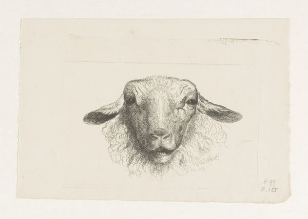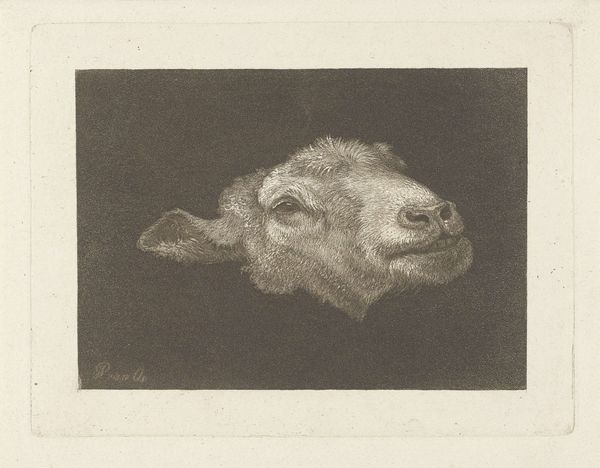 "Koeienkop naar rechts," or "Cow's Head to the Right," is an etching made by Simon Andreas Krausz, an artist born in the mid-18th century during the Dutch Republic. At this time, the Dutch countryside was both a source of national pride and economic prosperity. Krausz lived during a time when the rise of scientific thinking began to impact society. There was a growing interest in observing and documenting the natural world with precision. Krausz's choice to depict a cow may reflect broader cultural values of the time, with the animal being both an intimate portrayal and symbol of wealth. The simple and rustic subject matter could also reflect the cultural movement where artists sought to depict everyday life and ordinary subjects, celebrating the dignity of labor and rural existence. The portrait challenges traditional, idealized representations. It's an intimate, and emotional encounter with the animal, offering a glimpse into the relationship between humans and nature.