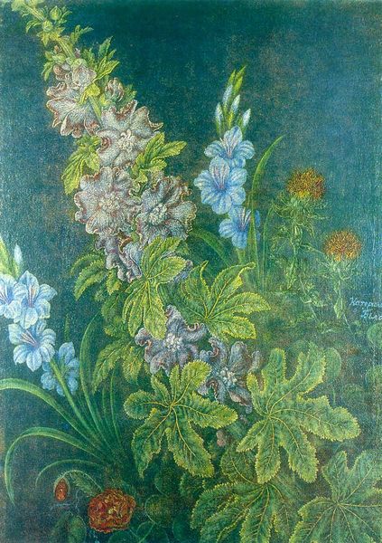 Curator: Look at this piece, painted in 1959. It's simply titled "Flowers," created by the Ukrainian artist Kateryna Bilokur, using oil paint. What do you make of it? Editor: Well, initially, it strikes me as quite dense, almost overwhelmingly vibrant. The dark background makes the flowers jump out. A celebration of life, wouldn’t you agree? Curator: I’d say so. Bilokur worked outside the dominant Socialist Realist style, a remarkable feat considering the context. She celebrated the natural world as a form of cultural resistance, so her focus on Ukrainian flora wasn't just aesthetic. It was political. Editor: Interesting. To me, the cluster of different species brings forth a sense of nature’s bounty, like an offering. There is this harmony amid the varied blooms...I can't help but see it symbolizing something about Ukrainian identity, too. A bouquet of the nation, perhaps? Curator: That's a strong point. Her use of realism allowed a certain authenticity in representing what she saw. Yet it subtly opposed the idealized version of reality enforced in Soviet art. It wasn't blatant protest. It was more like gentle insubordination in oils. Editor: Absolutely. And her attention to detail. The luminosity! It conveys a sense of persistence, too, that something beautiful can arise from dark or difficult conditions. See the contrast between the rich yellows and blues, playing with that dark space? It is quite an emotional statement, as far as floral art goes. Curator: I concur. Bilokur navigated very difficult personal and socio-political circumstances, but it only strenghtened her convictions and ability to capture nature in such a vivid way. Her dedication speaks volumes about the social value of her work, despite not following established canons. Editor: Indeed. Exploring the flower bed with such attention to visual facts reveals the strength residing within apparent simplicity, which goes well beyond a simple depiction. It carries an aura of silent yet firm resilience, reflecting upon what can endure and overcome.