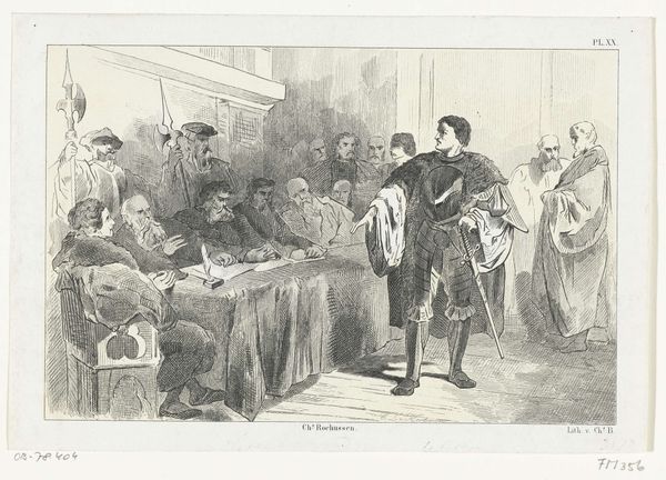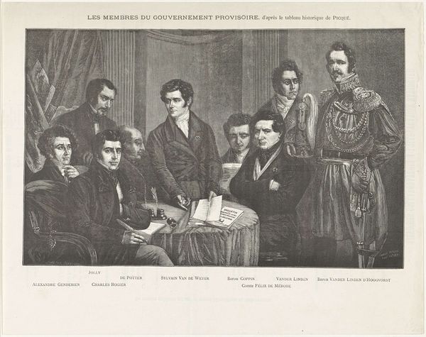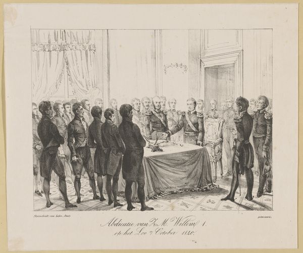 This anonymous print from 1840, titled "Abdicatie van Willem I, 1840", captures a pivotal moment with a muted palette. The composition centers on a stark table, around which figures cluster. The print's structure uses line and form to convey power dynamics. A clear division is visible between King Willem I and the men flanking him. Note how the figures are arranged; the king, though central, is seated and appears almost penned in. The men behind him are rigid and upright. The table, draped with cloth, acts as a barrier but also a stage for the abdication. The artist employs a semiotic language of gestures and poses to communicate the weight of the event. The act of signing becomes a symbol of transition, a visual marker of shifting authority. The print invites us to consider how images function as both historical documents and carefully constructed narratives.
