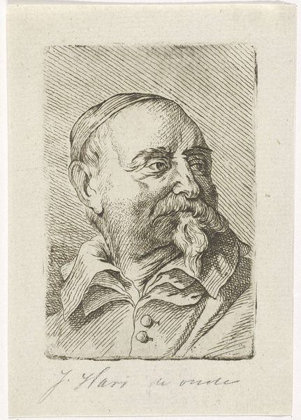 Editor: Hendrick Goltzius’s drawing, “Portret van Pierre Francheville,” created around 1590 using pen on paper. There's a certain seriousness to this portrait, almost…a quiet intensity in the man's gaze. How do you interpret this work? Curator: Ah, yes, intensity! I feel it too, staring back at Francavilla's own intense gaze… Almost unsettling, no? The meticulous detail of Goltzius’s line work certainly draws us in. It’s interesting to consider the time: the late 16th century. Mannerism loved that drama. Do you see how the slight asymmetry of the face almost heightens the realism, preventing it from becoming an idealized, emotionless representation? Editor: I see what you mean. The realism is definitely heightened, but there's something… theatrical about it too. All those decorative elements. Curator: Exactly! It’s a dance, isn’t it? Between capturing an individual and placing him within a certain social sphere. Francavilla was a sculptor himself, so this portrait would have been about presenting his artistic persona too. Perhaps we can appreciate it almost as if we were sitting with him, watching him do a sketch, even. What if he was drawing us right back, after all these centuries? Editor: It really changes my perspective seeing it as capturing a fellow artist… Thank you! Curator: Indeed! To appreciate Goltzius’ portrait, one can look closely at the rendering and allow ourselves to become drawn in with that piercing gaze! It makes us consider the artist's intention, which I think makes the work more intimate.