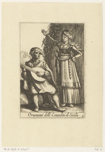 Curator: This is Albert Flamen’s “Man en vrouw in bos,” from 1672, made with engraving. It's a small scene, a couple encountering one another in the woods. I’m initially struck by the lines—they seem almost mass-produced, very economical. What jumps out at you? Editor: It feels like a staged encounter. How would you describe the scene and the relationship to the viewer? Curator: The lines, the texture—they weren’t spontaneously created; this was a methodical production. Each line laid down precisely in its space; we get a controlled environment. In this context the encounter feels staged as part of the artmaking process. Considering the time period and the social dynamics it reflects, what if Flamen presents this encounter through labor? This wasn’t a ‘one-off’ but more of an economic arrangement that mirrors and frames social encounters of the period. Can the production speak of broader themes? Editor: I see what you mean; the characters almost feel like they're participating in a routine. It makes you think about how different levels of the hierarchy were being used as labour. Curator: Exactly. Now, what about the lines themselves – what do you make of them in relation to production and value? Is there a feeling that a higher resolution would convey meaning? Editor: I hadn't thought of it that way before. Seeing it as a carefully produced item really shifts the whole interpretation for me. The economy of line isn't a flaw, it’s intentional; it’s efficient use of resources. I never imagined there were economic decisions reflected even there. Curator: I’m glad to have provided you with a different perspective; even something as simple as an encounter between two figures, when examined through the lens of materials and processes, has a ton of layers. It can offer fresh takes. Editor: Definitely, I'm seeing it in a brand-new way!