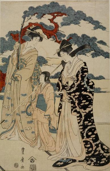 Editor: This is Kikugawa Eizan’s "Woman with Two Attendants." I’m struck by the delicate lines and how each figure seems to carry a specific weight in the composition. What can you tell me about the symbolism embedded within this work? Curator: Notice how the central figure is framed and elevated by the parasol and the attendants; this hints at her status and virtue. Are you familiar with the visual vocabulary of Edo-period Japan? Editor: Only in passing, really. I recognize some of the motifs, but not their deeper meaning. Curator: The cherry blossoms hint at a fleeting beauty, and the controlled color palette reinforces the mood of quiet contemplation. Does that influence your perception? Editor: Definitely. Knowing that context enriches the experience. I see it as more than just a pretty picture now. Curator: Indeed, the composition reinforces social hierarchy, with the woman's attire, fan, and posture all suggesting her elevated position. Editor: That's fascinating; I’ll keep that in mind moving forward.