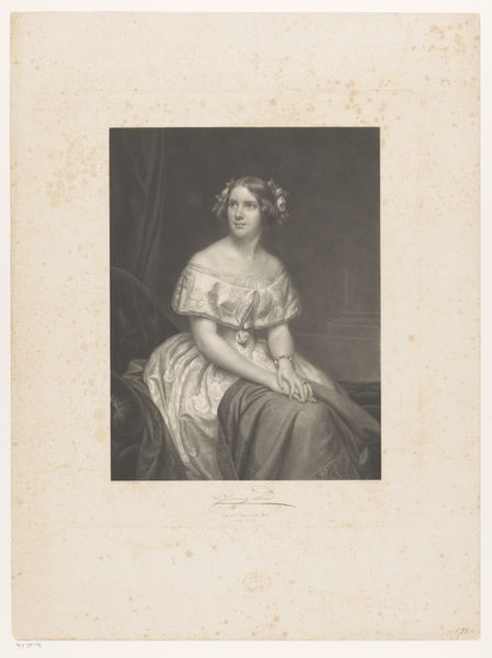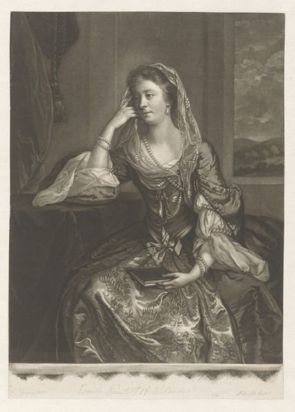 This print by Edward Fisher presents Kitty Fisher as Cleopatra. Notice how the composition is built around the sitter's gaze, directed away from us, which pulls our eyes across the plane, engaging with the dramatic tension of the cup and pearls. Fisher plays with the semiotics of portraiture, contrasting classical symbols of power with the sitter's celebrity. The pearls become a signifier of both wealth and impending demise, destabilizing the traditional association of pearls with purity and virtue. The contrast of light and shadow brings a tactile quality, enhancing the viewer's engagement. This artwork doesn't just represent Kitty Fisher; it uses her image as a battleground for ideas about beauty, morality, and power in the 18th century.
