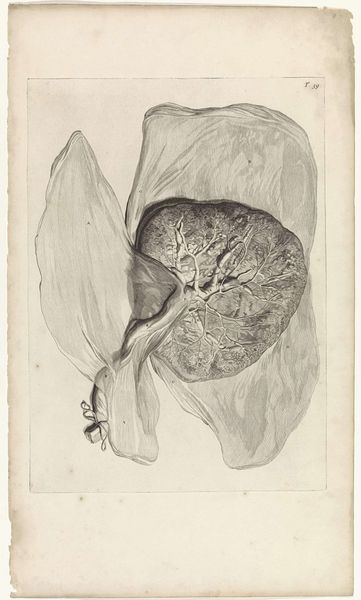 This is Pieter van Gunst’s “Anatomische studie van het vrouwelijk voortplantingsstelsel en de nieren,” made sometime before 1724. This detailed print on paper uses etching and engraving, processes that demand meticulous labor and skilled handiwork. The image is a product of the printmaking era, when such works played a crucial role in disseminating knowledge. Note the precision van Gunst achieves: the textures of the organs are delicately rendered, and the network of veins are clearly delineated. The artist's skillful manipulation of light and shadow brings a sense of depth to the two-dimensional surface. The social significance here lies in the democratization of scientific information. Before photography, prints like these were vital for medical education, allowing complex anatomical structures to be studied and understood by a wider audience. Consider the work that went into each impression, and how that labor contributed to the advancement of science. It's a powerful reminder of the interplay between artistic skill, scientific inquiry, and the broad sweep of cultural progress.