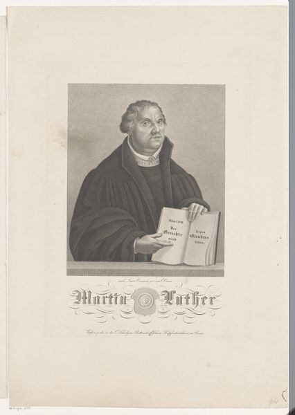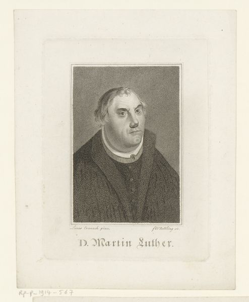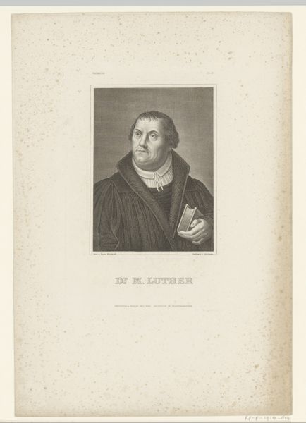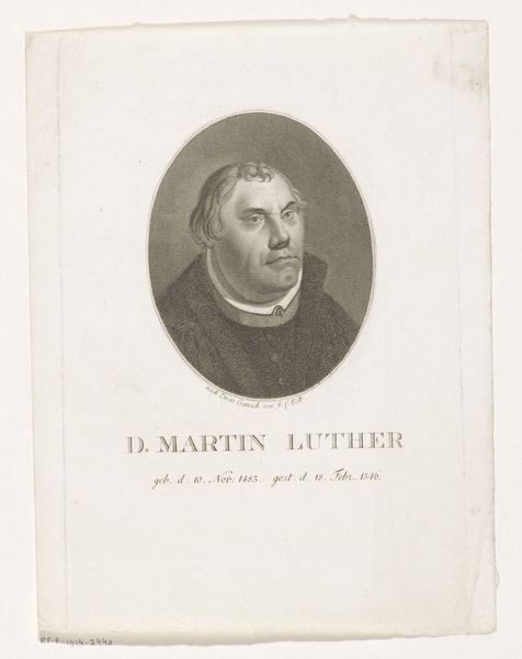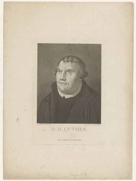 This portrait of Martin Luther was made by Albert Schule, likely sometime in the mid-19th century. It's a print, created by incising an image into a metal plate, inking the surface, and running it through a press. The real magic here is in the matrix: the metal plate from which the image is transferred. The process involves meticulous labor, the cutting of fine lines to create the image, a kind of hand-work that stands in sharp contrast to the mass-produced quality of the print. This tension between the handmade and the mechanical is important. Consider also the subject. Luther was a key figure in the Reformation. The printing press was essential to spreading his ideas, enabling his message to reach a wider audience. The availability of this print itself, echoes the historical importance of the printing press as a tool for democratization and mass communication. It's a fascinating combination of artistry, labor, and historical significance.