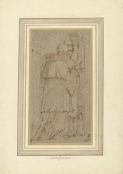 Editor: This is "Stoet van drie monniken," or "Procession of Three Monks," a pencil drawing by Bernardino Poccetti, dating from the late 16th or early 17th century. The figures are very somber and subdued. How do you interpret this work, particularly its social implications? Curator: I see this piece as a window into the social and political anxieties of the Counter-Reformation. Notice the repetition and almost anonymity of the figures. These are not portraits of individuals but rather representations of a collective identity tightly controlled by the Church. Do you observe the grid-like structure underneath the figures? Editor: Yes, I noticed it. Is it part of the work? Curator: Indeed. The grid might underscore an attempt to contain or quantify spirituality, turning devotion into something regimented and predictable, and something controlled from above. Consider also, who had access to the skills and materials for drawing at this time, and what the selection of that imagery communicates. What impact would a piece like this have had in a society grappling with religious upheaval? Editor: That’s fascinating. I hadn’t considered the grid as symbolic of control, but it makes sense given the historical context. So the drawing itself becomes a commentary. Curator: Exactly. And the somber mood reinforces this idea. It's a powerful statement on the tension between individual faith and institutional power. Do you agree with this activist approach? Editor: Absolutely. Thinking about it this way gives the drawing so much more depth and relevance. I will never look at it the same way. Curator: Wonderful! Art challenges us to ask these tough questions.