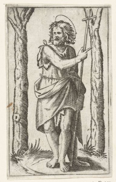 This engraving by Marcantonio Raimondi depicts Saint Roch as a pilgrim, a beacon of hope during times of plague. The saint is identified by his pilgrim's staff and the bubo on his thigh, a clear indication of his suffering. We observe Roch’s raised hand, a gesture of supplication, echoing through centuries of iconic imagery. Consider the Orant figures of early Christian catacombs, their arms raised in prayer, a plea for divine intervention. This gesture transcends its immediate context, appearing again and again, a powerful symbol lodged deep within our cultural memory. The bubo, usually a symbol of death, paradoxically signifies Roch's healing power over disease. Such paradoxes are powerful. They represent the cyclical nature of human experience. From the depths of despair, hope can arise, transforming symbols of suffering into emblems of resilience. Roch’s image thus becomes a potent reminder of humanity’s enduring spirit.
