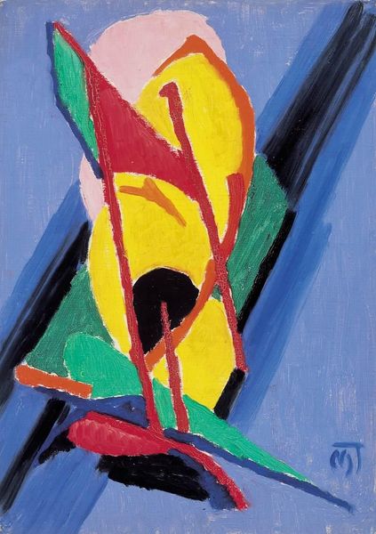 Editor: This is "Composition" by Janos Mattis-Teutsch, created in 1922 using oil paint on panel. The bright colors feel surprisingly joyful, almost defiant, against the somewhat somber background. How do you interpret this work, considering its historical context? Curator: Given the social and political turbulence of the early 1920s in Europe, particularly in the aftermath of World War I and the rise of various modernist movements, this painting's vibrant colors and geometric forms are intriguing. This Expressionist piece could be a rejection of established artistic norms and also perhaps a visual response to the instability and rapid changes occurring in society. What about the composition strikes you? Editor: I see these sharply defined shapes, almost fighting for space within that soft, rounded frame. It's like order imposed on chaos. Curator: Precisely. Think about the institutions that were gaining or losing power then, the artistic manifestos being published, the new ways of seeing and being. The centralized composition in this painting, does it remind you of anything? Does the color have any specific historical meaning? Editor: I see your point! Maybe the centralized composition symbolizes the struggle for stability or perhaps the color are an intentional attempt to counter prevailing bleakness. But how did the art world react to this kind of work? Curator: Works like this often faced harsh criticism from more conservative factions, who saw them as degenerate or incomprehensible. However, they were embraced by avant-garde circles eager to explore new visual languages that reflected their experiences of the modern world. Mattis-Teutsch's work offers a glimpse into that complex dialogue. Editor: I never considered how art becomes a visual commentary on social and political change, or even shapes social perceptions. That's really fascinating. Thanks! Curator: Indeed. It’s through considering the public role of art that we understand its true power. Thank you.