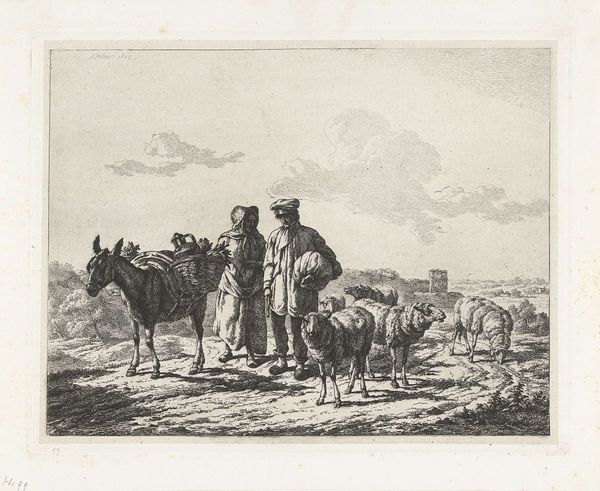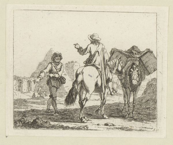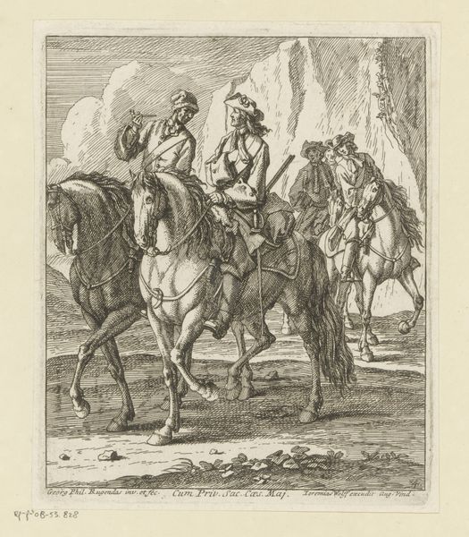 Editor: We’re looking at “Ruiters in een tentenkamp” – "Riders in a tent camp", in English – an engraving by Georg Conrad Bodenehr made sometime between 1686 and 1710. The detail is amazing, especially on the horses and the tent fabric! I'm struck by how orderly the camp seems, even though it's a military scene. What do you notice first when you look at this? Curator: Well, first, I’m transported! It’s like stumbling into a play, isn't it? Everyone is so posed! See that figure on the right, on horseback, seemingly holding forth? He’s practically a baroque orator! Then you have the slightly comical figures near the tent – their task looks rather… earthbound. It's a fascinating tension – the elevated figures and the mundane chores. And the horses! Aren’t they magnificently rendered? Do you think Bodenehr himself might have been partial to these equine figures? Editor: I do. Their nobility adds such a captivating mood to the scene. It also highlights their masters' affluence. Does the fact that it’s an engraving, rather than, say, an oil painting, affect your reading of the artwork? Curator: Absolutely. The very act of engraving – the precision, the commitment to line – it lends an air of formality. Perhaps that’s where we get the sense of order. And you know, engravings were often made to disseminate information, to spread an image far and wide. So, consider who the audience might have been! Are we celebrating military prowess, or simply documenting it for posterity? Food for thought! Editor: This makes the details really resonate: everything has been included for a purpose! It really enriches my appreciation of the work. Curator: Precisely. Art sleuthing, revealing stories layer by layer! That's what I adore about art history.
