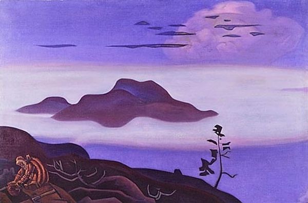 Nicholas Roerich painted "On the lake. Shop Pangalo" with tempera on cardboard, a departure from traditional oil on canvas. Tempera is a fast-drying medium, often made from egg yolk, which lends the painting its distinctive matte finish and vibrant, yet soft colors. Roerich's technique involves layering these tempera paints to create a sense of depth and texture, especially noticeable in the rendering of the rocks and water. The materiality of tempera, with its quick-drying properties, demanded a swift and decisive approach, likely influencing Roerich's simplification of forms and bold color choices. This choice of material reflects Roerich's broader interest in exploring ancient techniques, connecting his art to cultural and spiritual traditions beyond the Western canon. It moves away from the established norms of the fine arts, and brings it closer to the realm of craft. Appreciating this element of making is essential to understanding the painting's unique aesthetic and its place within Roerich's artistic vision.