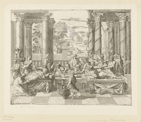 Curator: Oh, I am simply swept away by the beautiful undertones of "The Wedding at Cana", a drawing, existing in our collection at the SMK, Statens Museum for Kunst. A toned paper base, and worked on during the artist's lifetime, 1518 to 1594, if you can believe that. Editor: It feels, to me, like the organized chaos of any really good party, honestly. You know, people lugging kegs, other guests watching with amusement and, yes, with the kind of architecture of an unreal Italian ballroom where actual magic could happen, too. It makes you wonder, looking at this, about the conditions that made it real for the artist in the first place. Curator: Indeed. One cannot help but notice the sketchbook-like quality of this piece; an incomplete sketchy feeling, reminiscent of a watercolour illustration, so, maybe, originally intended for larger explorations. Perhaps it's even fair to say it's of a personal sketchbook nature? We're also definitely looking at a mixed medium production, I believe. The line work is exquisite, and then it has that very human sense, where we aren't exactly quite finished, but close enough that the eye fills the gaps. Editor: I like that interpretation! Think about it, though: Sketchbooks were sometimes presentation pieces themselves, meant to showcase the artist's thought process, or even the virtuosity of capturing something fleeting. This feels almost performative—showing not just the biblical event, but also the labor behind any grand celebration. People forget there's labor at all. Someone had to get these giant water jugs ready before they turn into wine. I wonder what type of pens, inks and other instruments went into creating something like this? Did it happen within the confines of a well-equipped workshop? Was there someone else handling pigments? All the "magic" in this image happened by someone's labor, and skill, for the purpose of an art that both reflects it, and might overshadow it too, for us, right now. Curator: True, but at least in this iteration, it almost elevates it from what could be mere material. In the end, I return again to the light and airy quality and get utterly carried away once more, knowing it is unfinished, not quite final, but full of the initial wonder. Editor: And for me, I am considering that this image might, in its incompleteness, prompt one to imagine everything that went into making it; all the work and social relations that come to light as part of its process.