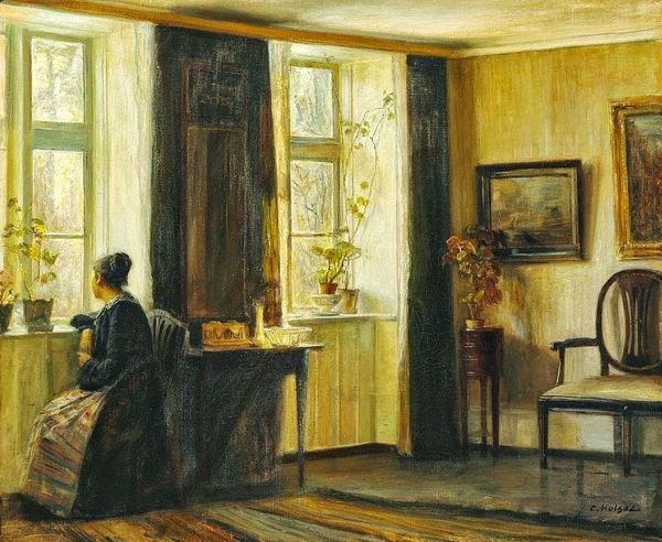 Curator: Look at this painting, "Clearing Away the Tray," an oil painting by Carl Holsøe, offering a slice of life bathed in quiet introspection. Editor: My first impression? Tranquility. The light, the muted tones… it feels like stepping into a hushed room in a sun-drenched afternoon. There is some kind of soft luminescence radiating from within. Curator: Exactly. Holsøe really captures the domestic sphere. Notice the composition. The woman, rendered almost as a silhouette, stands beside a dark wood cabinet, carefully placing what looks like a tea tray. Editor: Yes, that figure is so integral. Consider her placement; near the cabinet, in soft lighting, she is the fulcrum of this piece. Is she confined, or is there peace, an essence to find in such routines? Is she alone? Curator: Well, his interiors often lack explicit narrative, encouraging subjective interpretation. He doesn't dictate a story; he provides a stage. And regarding those colors: Observe the almost monochromatic palette, varying shades that grant volume and create a scene that exists as much as a tonal experience. Editor: The geometric construction is interesting, also. The verticality of the furniture and door frames contrasts beautifully with the oval mirror hanging behind the table setting to create depth. The planes of light that fill that space is divided, as it is reflected. It creates rhythm. Curator: Holsøe was clearly skilled at manipulating light and shadow to evoke emotion, almost as if each stroke were imbued with hushed whispers. Do you find you hear anything coming from the painting? What stories do the echoes of silence tell, and what meanings can one person find, opposed to another? Editor: Perhaps it speaks of transition. Of the quiet moments between larger events. The painting feels like a single, sustained note played on a piano, resonating long after the sound itself has faded. Its lasting impression might depend on which key each individual finds that best suits it to linger, too. Curator: An intimate view, rendered with sensitivity. That's the essence, as it allows us to appreciate it here today, the world around this domestic depiction almost faded behind us, only to find that one singular essence you noted a few minutes back. Editor: I see that lingering essence too.