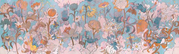 Curator: Right now, we're looking at "I Love You to Death" by Cassidy Rae Marietta. The colors hit me first; it's quite a bright yet unsettling composition. What jumps out at you? Editor: That black sun, undeniably. Its void seems to leach color even from the vibrant chaos around it. Look closer; mushrooms pierce her flesh, as bones encircle her arm. There is a powerful use of nature. What might all that signify? Curator: Well, I immediately interpret this through a feminist lens; the female figure intertwined with decay—simultaneously victim and powerful figure navigating oppressive expectations. The skeletal embrace suggests a relationship with death that’s forced and perhaps self-imposed, related to societal pressure. Editor: Agreed. And those vibrant plants; the work evokes a complex life cycle—fertility juxtaposed with stark death. Look at how the artist uses bold graphic outlines to define shapes. What choices drove those specific visual markers in constructing these figures and forms? Curator: That graphic treatment lends a sense of unreality. The work reminds me of surrealist portraiture; I would place this within larger narratives around female autonomy, body image, and power dynamics in interpersonal relationships. It questions the expected life scripts presented to young women, I think. Editor: I see that; however, look again at those plants. Those are obviously flowers and mushrooms, perhaps dye plants or hallucinogens, with particular material and cultural values across time and geography. Perhaps Marietta wanted us to think of their possible origins, who gathers them and where, who consumes and makes things from them. Curator: An intriguing proposal. I didn't immediately interpret the landscape through that economic or labor-based lens, but it certainly shifts the dynamics of the conversation in really valuable ways. Editor: I agree; the beauty lies in holding both readings in our mind simultaneously. A valuable exercise that hopefully shapes and directs contemporary thought and creation. Curator: Indeed. It encourages us to remain flexible, to always remain open to evolving ways of viewing our own lives and our work in art.