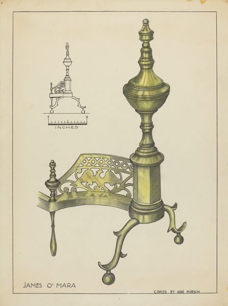 Curator: Well, this has an oddly charming feel. I find the rendering almost dreamlike, as if the object is from a distant memory. Editor: You've certainly hit upon something interesting there. What we're looking at is a mixed-media drawing from Hans Korsch, titled "Andiron", likely created between 1935 and 1942. Curator: Andiron… the simple definition would be that this is a bracket to support logs in a fireplace. However, the care with which Korsch rendered it speaks of deeper meanings. Notice how other drawings are sketched beside the more photorealistic rendering, and each element feels culturally charged. The one beside it is particularly intriguing. It reminds me of an emblem, perhaps a monument. Editor: You've nailed what grabbed me. That auxiliary drawing bears iconography reminiscent of masonic symbolism—a clock face radiating light above what seems to be a column, flanked by flags… quite peculiar given the time period. Given that Korsch fled Europe in 1938, one cannot help but see a sociopolitical commentary at play in an object designed for domestic comfort and hearth. Is he perhaps, intentionally or otherwise, drawing lines of contrasts of domestic safety vs. an unsettled external sociopolitical context? Curator: Absolutely. The additional studies that appear in this mixed-media drawing invite the viewer into the design process itself. Korsch seems interested in more than merely illustrating this particular object: he imbues the domestic sphere of the hearth with multiple cultural and historical meanings, reminding us that even in times of relative peace, sociopolitical unrest is looming just outside the warmth of our fire. Editor: I see that connection—the fire, typically associated with comfort and refuge, is offset by other loaded imagery of a more ominous, uncertain future. Korsch seems very deliberate about this association, a subtle juxtaposition, perhaps to encourage people to critically engage with the socio-political landscape, especially during times when the symbolism suggests an ominous outlook on liberty and governance. A simple, domestic object with immense, historically relevant, implications.