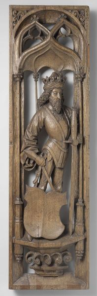Curator: I'm immediately struck by the solemn presence of this figure. The carving evokes such a strong sense of hierarchical power dynamics, doesn’t it? Editor: Indeed. This is one of the panels from an organ case, dating back to around 1510-1520. The church of Saint Vitus in Naarden once housed it, and it's attributed to Jan van Schayck. It exemplifies the Northern Renaissance style through this detailed wood relief. Curator: Knowing it was part of an organ case gives context. The visual authority echoes the auditory dominance of a church organ; however, I wonder about the absence of the other panels. What stories were silenced when pieces disappeared, leaving us only with the male figure? How does this affect its interpretation now? Editor: It's true that context is always shifting, never entirely accessible to us. It’s plausible that there was a carefully arranged iconographic program across all the panels, now mostly lost. We can speculate about what their complete message may have conveyed to the original congregation, given this artwork was once central to the community’s life and devotion. Curator: Precisely. The visual impact centers around this central male figure’s crown and garments suggesting political power reinforced by this sacred architectural placement. It prompts one to consider the function of these figures in constructing and reinforcing societal hierarchies during the Northern Renaissance. Editor: His very serious gaze adds to the feeling. I’m curious as to the extent this imagery may reflect or support the political and religious upheavals of the time. Images had direct implications during a Reformation that reshaped communities across Europe. It's important to think about how this sculpture worked as propaganda or self-representation of a ruling class within the framework of growing tensions with religious establishments. Curator: Absolutely. This carving gives rise to vital inquiries regarding artistic representation, political messaging, and their repercussions in a changing historical landscape. Editor: It truly gives a fascinating window into that turbulent intersection of faith, power, and society. Thank you for illuminating all of this!