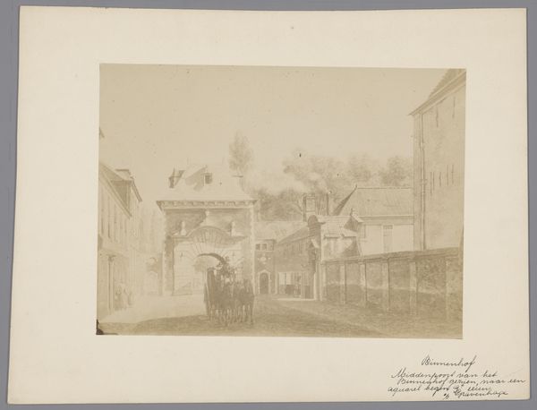 Editor: This is a photograph from 1901 titled "View of the old city wall behind the gymnasium in Maastricht." It seems to depict a slice of ordinary life right up against the historic wall. The sepia tone lends it an air of nostalgia. What aspects of this image strike you most profoundly? Curator: What immediately grabs me is the juxtaposition of the "old" and the seemingly "new" – in 1901 of course. We see the crumbling, medieval city wall being used, almost as a foundation, for everyday structures, implying a changing cityscape. Note the figures with the wagon, likely engaging in some sort of commerce. This imagery serves not just as documentation of architecture but also as an active tableau. Editor: So, the placement of daily activities next to the old city wall, is that supposed to say something about progress and social dynamics at that time? Curator: Exactly. The photograph underscores the tension between preserving history and adapting to modernity. What’s interesting here is: Who commissioned this photograph? Was it for historical record, or for municipal planning? The very act of photographing the wall signifies its perceived importance – or perhaps, its impending disappearance. Consider the politics of representation; how might this image have been used to advocate for preservation or development? Editor: That adds another layer to it. I was just looking at it as a slice of life. Curator: And that's perfectly valid! But let's think: If this image were widely circulated, what kind of public discourse might it have sparked? Editor: That is quite eye-opening, thinking about how art really does affect politics and history. Thanks for the guidance. Curator: It has been my pleasure, and the pleasure's mine, to get me thinking about how photography shapes collective memory and civic identity.