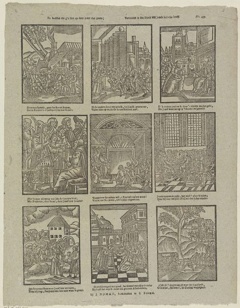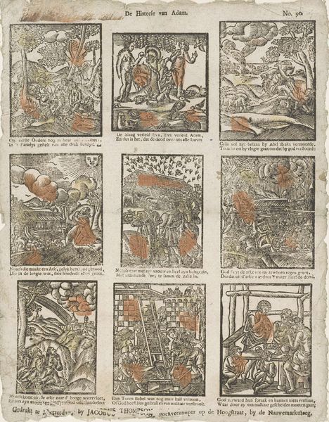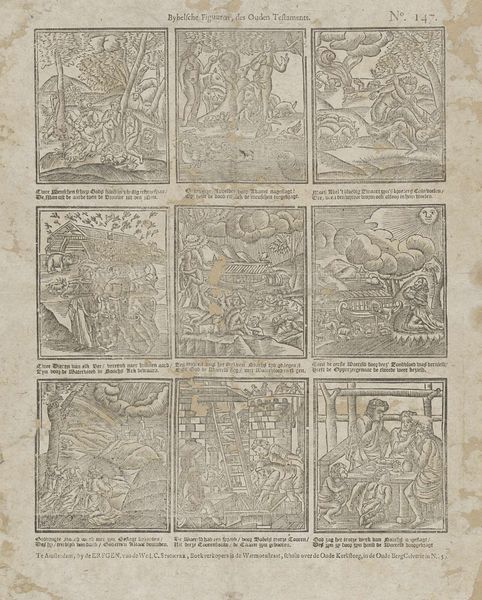 Editor: Here we have a print, "Leergier'ge jeugd die in Gods bladen... " It's a woodcut and engraving by Johan Noman, made sometime between 1806 and 1830, currently residing in the Rijksmuseum. The composition, divided into nine little scenes, gives off this vibe of an ancient storybook. What strikes you most about this artwork? Curator: You're right, it *feels* old, doesn’t it? The densely packed scenes remind me of illuminated manuscripts, or maybe even early comics! Notice how each scene tells its own miniature story. It’s less about realistic representation, and more about symbolic communication. Are you picking up on a particular narrative being pieced together? It makes me wonder what was popular in visual storytelling back then, wouldn’t you say? Editor: It definitely reads sequentially, almost like panels in a graphic novel! I guess each frame depicts a biblical tale… I see what looks like Noah’s Ark, maybe Adam and Eve too? It's fascinating to see these monumental stories distilled into such small, self-contained images. What impact does that have? Curator: Good eye! Precisely, shrinking the 'larger than life' figures gives an immediacy, and allows us to view them on a human scale. Back then, it was like bringing these ancient tales closer to home, almost domesticating divinity. It provokes reflection, right? It makes me ponder about faith... Were you drawn to its detailed engraving style at all? Editor: Absolutely! The precision within the small size is impressive. It adds an austere and thoughtful mood to what are dramatic biblical moments. Curator: Exactly, the texture amplifies their potency. Considering the limits with hand-carved wood or engraving back then, it must have taken such patience. What do you make of the texts interwoven throughout each scene? Editor: It's interesting how the text both labels and interprets the images. It makes it very didactic, it shapes how the stories are read visually, perhaps narrowing down their meaning to guide "Leergier'ge jeugd"—'zealous youth'. This artwork gave me a completely fresh idea on how cultural context affects storytelling! Curator: Precisely! This makes one question what new possibilities lie beyond these miniature panels. The intersectionality is a constant dialogue isn’t it!