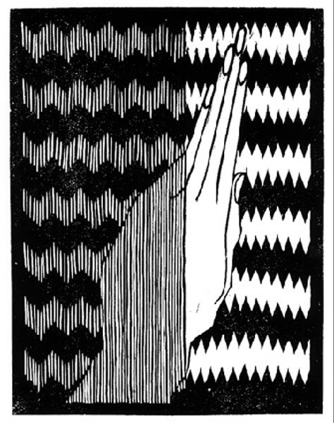 M.C. Escher made this print, Fishes in Waves, without a date, using a monochrome palette of black ink on white paper. The rhythm of alternating fish and waves becomes an investigation into the relationship between figure and ground. Look at the interplay between the horizontal lines of the waves and the fish swimming against them. Notice how the artist creates a sense of depth and movement through the repetition and variation of shapes. Escher employs the simplest means to explore complex visual relationships. One of the things that interests me most is the subtle variations in the thickness of the lines, which give the image a tactile quality despite its graphic nature. It reminds me of the Op Art of Bridget Riley, although Escher’s work has a playfulness and humour all its own. Escher's art invites us to question our assumptions about perception, and to revel in the endless possibilities of visual representation.