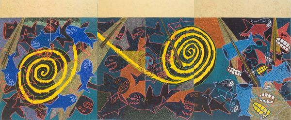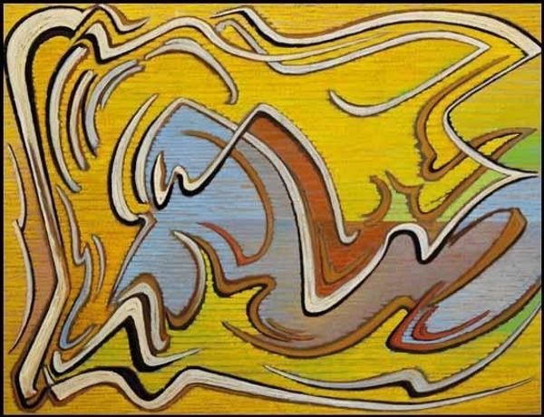 Editor: Here we have Lawren Harris's "Abstraction 30," created in 1955 using oil paint. I am really intrigued by the blending of colours, it looks quite Fauvist to me, with all the yellows, blues and greens, and how they work to create almost geometric forms. How would you interpret this artwork? Curator: Focusing solely on its internal structure, the painting exhibits a fascinating tension. Notice the interplay between curvilinear and rectilinear forms. The flowing lines in the foreground contrast sharply with the more defined shapes above, creating a sense of visual dynamism. Editor: That's interesting. So you're less concerned with what Harris *meant* to depict and more about the shapes themselves? Curator: Precisely. Observe the use of colour. The predominantly yellow palette, punctuated by blues and greens, creates a harmonious whole, yet the tonal variations within each colour contribute to a sense of depth. Could we analyze the geometric planes within that larger curve in the foreground? How do you see these structural relations working? Editor: I hadn't thought about it that way before, but it’s all in the relations within that larger segment and how it works to propel our understanding of foregrounded vs backgrounded images. Curator: It's about how the formal elements—line, colour, shape, texture, composition—function and create the artwork's internal logic, and in turn what constitutes an appeal to the viewer. The materiality of the oil paint, the very texture, and stroke, are all part of the analysis. What a stunning engagement with the inherent possibilities of abstraction. Editor: I can see how focusing on those elements brings a different appreciation to this work. Thanks, that was fascinating! Curator: My pleasure.