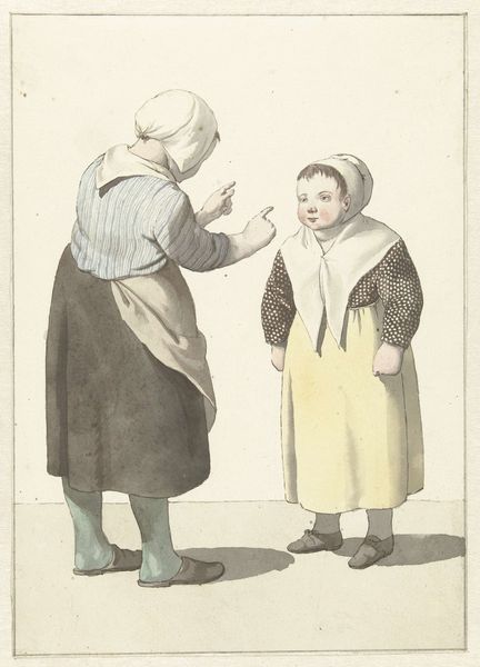 Curator: It feels like a fleeting moment, doesn't it? A little play caught in watercolor. There’s something sweetly humorous and utterly relatable about this encounter. Editor: Here we have a drawing called "Stoffenverkoper onderhandelend met een vrouw," which roughly translates to "Fabric seller negotiating with a woman," by W. Barthautz, dating from somewhere between 1700 and 1800. It’s a genre painting, depicting an everyday scene rendered in watercolor. Immediately striking is its commentary on trade, and how commerce inserts itself into social dynamics. Curator: Absolutely, and that slight upward tilt of her chin suggests her readiness to parry! Her expression suggests the calculation in haggling. You know, I've got my eye on that basket, or should I say that entire stack of wares resting rather conspicuously on the peddler's back? Editor: The size is remarkable, almost a caricature, amplifying the already dynamic between them. These sorts of images, popular in the 18th century, really tap into broader anxieties and ideals about the burgeoning merchant class and the roles people were expected to play. Gender, class, commerce...it’s all in play. Curator: He's so…formal? In that almost sad, stiff posture. There's a disconnect that elevates it, I think. This reminds me, did people even want these watercolors? I picture people stumbling on things like this as hidden treasures decades later! I imagine this marketplace coming to life with the colors they picked. Editor: Well, consider the context: the rise of the art market itself, alongside increased urbanization. Suddenly, images like these offered a lens into social strata, validating, criticizing, or simply documenting life for a rapidly expanding urban audience. Collecting art was becoming a civic ritual, a status marker. This piece is less about capturing raw emotion and more about reflecting back at society its evolving image. Curator: You know, seeing the soft way the watercolor washes together... and thinking about society so formally categorized...it gives the moment a special meaning, don’t you think? Like the colors, everything shifts to create something else altogether... Editor: Yes, exactly! It reveals how the period used art not just to represent reality, but to actively shape perceptions of it. Thank you, Barthautz, for the subtle disruption, even three centuries on!