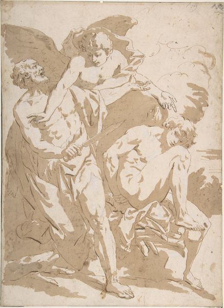 Luca Cambiaso rendered this drawing of Apollo flaying Marsyas with pen and ink. The myth tells of Marsyas, a satyr who dared to challenge Apollo in a musical contest. The victor could treat the vanquished any way he pleased; Apollo won and chose to skin Marsyas alive. This gruesome act, depicted here, is rich in symbolism. The flaying, the removal of skin, speaks to a deeper stripping away of pride and hubris, a painful unveiling of one's true self. It echoes in the imagery of other doomed mortals, like Icarus falling from the sky, a cautionary tale of overreaching ambition. The motif of flaying also resonates with religious martyrdom. The agony of Marsyas engages viewers on a subconscious level through gestures of intense emotional states, like despair. The image evokes complex emotions. This is a stark reminder of the cyclical nature of hubris and downfall.