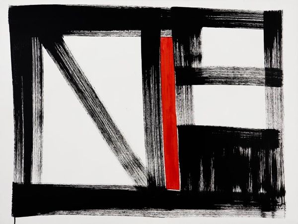 Curator: Here we have Denis Bowen’s "Red and Black (Flying City Series)." The date is unknown, but it is part of the Tate Collection. Editor: My first impression is tension. The bold red slashes fight against the stark black background. It feels almost confrontational. Curator: Red and black are powerful colours, often linked to primal emotions. The aggressive brushstrokes and overlapping forms could symbolize the chaotic energy of modern urban life. Editor: It also reminds me of protest art. The red could symbolize anger, the black mourning. Is this a commentary on social unrest, perhaps? Curator: It's certainly open to interpretation. Bowen's abstract style invites viewers to project their own feelings onto the work. Editor: I find myself dwelling on what this flying city represents – is it progress or impending doom? A utopia or dystopia? Curator: Yes, the ambiguity is key. It's a potent reminder of the complexities inherent in any grand vision. Editor: Well, it certainly gives you much to consider. Curator: Indeed, a piece that resonates long after you've moved on.