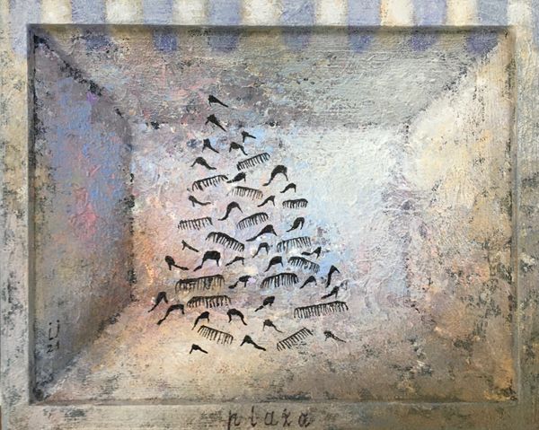 Curator: Here we have Lech Jankowski's "tab ur ettier," created in 2021, using a mixed-media approach incorporating both oil and acrylic paints, with the application of impasto. Editor: My initial reaction is of an almost desolate interior. The colour palette is muted, creating a sense of emptiness. I’m immediately drawn to the textural surface and what seems to be deliberate roughness. Curator: Considering its socio-political landscape, post-Soviet identity is a likely, underlying theme in Jankowski’s abstract compositions. "tab ur ettier" may be understood within narratives exploring individual struggle and displacement, issues amplified within the context of broader historical changes and echoing sentiment from matter painting and Modernism Editor: Absolutely. Looking more closely, the geometric form provides a framework that structures the composition, creating implied depth within a relatively shallow plane. The way the colours are modulated creates an impression of light. Are we looking at a modernist construction, almost reduced to its bare bones? Curator: It certainly speaks to that interpretation, particularly if viewed as a metaphorical interior. Consider that for those marginalized, physical space—and the notion of a "home"—becomes highly charged, embodying security, identity, and belonging…or the lack thereof. I also want to add that the paint, the colors used are almost bleak, very depressive almost. Editor: Indeed. And how do the roughly applied brushstrokes contribute to the overall mood? There’s very little blending, if any. The drips running downward add a sense of urgency. Curator: Urgency, but also a sense of entropy. These stylistic choices reinforce themes around disintegration that is central to abstract-expressionism. The painting reads almost as an allegory, a post-Communist condition expressed with emotion in our modern landscape. Editor: Thank you, I find this insightful. Curator: I completely agree. A profound, historical work!