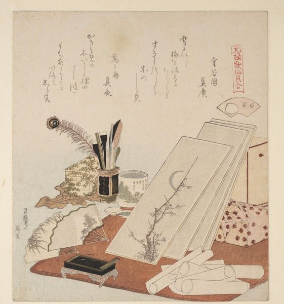 Curator: Yashima Gakutei's "Writing Materials, Pot of Adonis (Fukujuso) and Screen, with poems by Kasaitei Mayoshi and Kyokado (Shikatsube no Magao)" presents a serene, almost meditative space. The woodblock print captures a scholar's desk with remarkable detail. Editor: Immediately, I’m struck by the symbolic weight of the objects: the Adonis flower representing renewal, the screen hinting at hidden realms, and the writing implements signifying knowledge and creativity. Curator: Indeed. The arrangement reveals much about Edo-period artistic and literary circles. This piece perhaps hints at the societal value placed on intellectual pursuits and aesthetic appreciation. Editor: Look at the recurring wave motif! The stylized waves behind the desk create a backdrop suggestive of constant change and the flow of ideas. Curator: And consider the poems incorporated into the design. This interweaving of text and image was a common practice reflecting an integrated approach to art and culture. The Harvard Art Museums possesses this evocative piece of Japanese history. Editor: Yes, and it reveals a symbolic language still resonant today. Looking at it now, I can almost feel the pulse of creativity in this space.