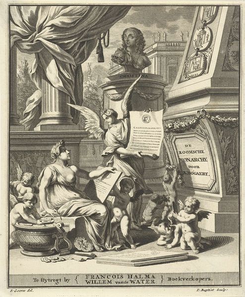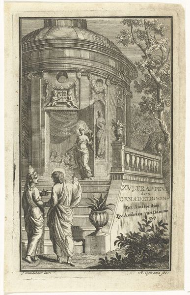 Curator: Immediately, the steps draw my eye upwards toward the female figure with that striking halo, exuding this serene, ethereal presence. Editor: That's quite astute. We're looking at the title page for "De trappen des genadetroons van Jesus Christus," which translates to "The Steps of the Throne of Grace of Jesus Christ." The print, made with engraving techniques, dates roughly between 1717 and 1759, created by Michiel Elgersma. Curator: "Steps of Grace" feels so charged, doesn't it? Like a deliberate visual journey towards… what exactly is she offering? What is the meaning behind the Temple structure at the top of these stairs? Editor: Temples always stand for important things in our collective imagination. The architecture here seems to be classical—note the pediment held by angel figures—a link to the grandeur and authority of Rome. This is Baroque art—think about the religious and political forces at play during that period, always seeking ways to make the scripture visually authoritative for the masses. Curator: Indeed, but consider the figures too! Those classical statues are a sharp contrast with Christ and who is possibly St. Peter shown ascending. Peter, who has those keys to heaven on his shoulder—keys also tied to Roman power since the papacy saw itself as the holder of the symbolic and physical keys to Heaven and St. Peter's basilica. Editor: An interesting point! Then consider the very nature of steps themselves: thresholds in a historical and spiritual sense, between worldly experience and divine grace. Perhaps the print as a whole comments on the very processes that offer redemption. Curator: Exactly! Look at that veiled face on the steps: repentance. You know this is Baroque religious symbolism that touches on our emotions and offers moral guidance. It invites us to look inward and upwards, simultaneously. Editor: Well, Elgersma certainly knew how to construct not just a print, but an ideological stairway. I do wonder what impact the prints made on their original audience, now that it has been transported to the digital age. Curator: Right. This definitely requires much more viewing and reflection! I am going to dive more into what a 'throne of grace' truly means in Baroque and older visual art.