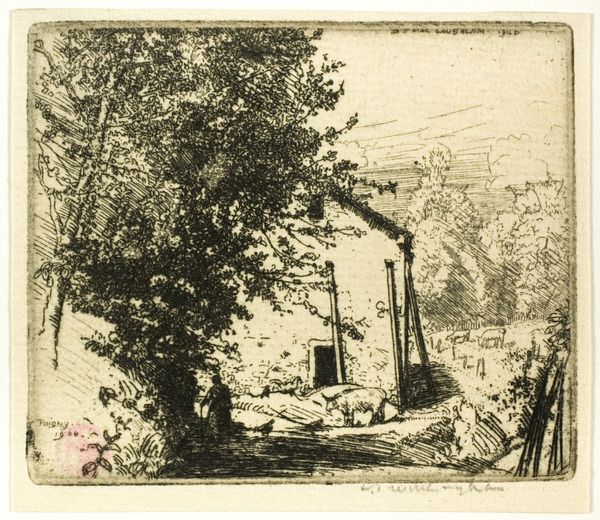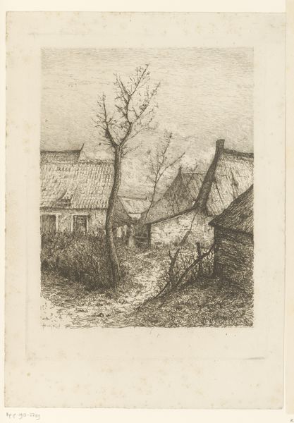 Adolph Menzel created this etching titled "Plate six, from Radierversuche." The composition directs our gaze along a receding path, framed by a stark building on the left and dense foliage on the right. Menzel masterfully uses line and texture to create depth. Notice how the dense, chaotic lines in the foreground gradually lighten as they move towards the horizon, suggesting distance and atmospheric perspective. Menzel's technique challenges traditional notions of representation. Instead of striving for photographic realism, he embraces the expressive potential of the etched line. This emphasis on process and materiality reflects the broader artistic concerns of the 19th century, as artists began to explore the inherent qualities of their chosen media. Ultimately, this print invites us to consider how an artist can transform a seemingly mundane scene into a compelling visual experience. The lack of clear, defined forms encourages us to engage actively with the image, piecing together our own interpretation of the depicted space.