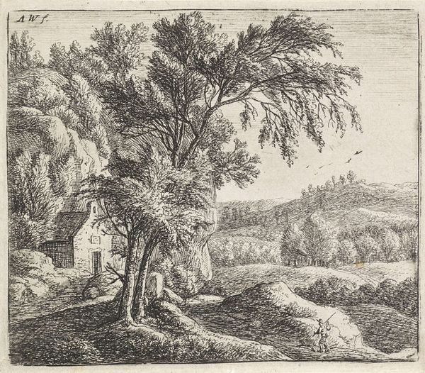 Adrianus Serné created this landscape etching, titled "Heuvelachtig landschap", which translates to "Hilly Landscape," sometime between the late 18th and mid-19th century. Serné lived through the Batavian Republic and the Napoleonic Kingdom of Holland. These were times of political upheaval, as the Dutch Republic was replaced by French rule, followed by the establishment of the Kingdom of the Netherlands. In this context, landscapes can become charged with meanings related to national identity and cultural heritage. The image is of a common man, with his dog, on a path, in a wood. He seems to be minding his own business. The Dutch countryside, with its working folk, becomes symbolic of something deeper, a cultural heritage of independence and self-determination rooted in the land. Serné’s etching suggests a deep connection to the land and a desire to preserve and celebrate the Dutch landscape in a time of cultural and political change. It is an expression of identity intertwined with the love and labor for one’s country.