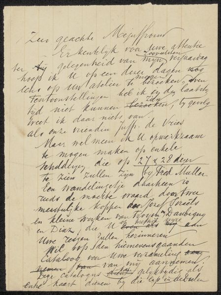 Editor: So, this artwork is a letter titled "Brief aan Jan Veth," likely from 1886, by Albert Verwey. It's an ink drawing, or perhaps a pen sketch, on paper. The handwriting itself is captivating, but it's more than just penmanship, isn't it? It’s more evocative. What historical context informs our reading of this handwritten piece? Curator: Absolutely. We have to consider the act of letter-writing itself in the late 19th century. Before email, texts, or even widespread telephone use, letters were vital for intellectual and artistic exchange. This wasn't merely a casual note; it was a tangible piece of social interaction, a substitute for being present. Knowing that this is addressed to Jan Veth is also key. Editor: Why Veth in particular? Curator: Jan Veth was a prominent critic, poet, and artist. So, this letter isn’t simply a personal communication. It likely relates to the art world or to some political moment of the time. The “public role” of Albert Verwey, which he fulfilled as a poet, seems very private in this rendering. We can also examine how Verwey positioned himself through this letter relative to figures like Veth and others they likely discussed. What do the references to the museum, nature, and paintings signify? Verwey crafts his own persona in relation to these institutions and the person to whom the letter is addressed. Editor: That reframes it. It isn't just a message. It's Verwey situating himself socially and professionally within the art and intellectual scene. The medium of the handwritten letter, normally very personal, then becomes quite purposeful. Curator: Precisely. And remember, handwriting analysis, even then, was often tied to assumptions about character and authenticity. The way Verwey crafts the content here gives us insights into social roles and cultural aspirations tied to public reception. Editor: This adds a layer of intention I didn’t initially see! It makes you think about the letter, the paper, the time taken to formulate these thoughts, the social landscape surrounding Verwey... it's like a time capsule.
