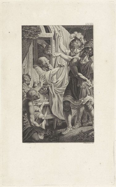 Editor: Here we have "Adoration of the Shepherds" by Jacob Folkema, made sometime between 1702 and 1767. It's an etching, a print, so it's been reproduced... What do you see in this work that really stands out? Curator: Well, looking at the means of production, it’s fascinating how an etching like this could disseminate a specific religious ideology to a wider audience. This isn’t just about the depicted scene but also about how easily this image could be circulated and consumed. It turns the 'divine' into a commodity, wouldn’t you say? Editor: That's interesting. I was focused on the almost caricature-like faces, and the classical composition of the figures. I hadn’t considered the mass production aspect. Curator: Consider the engraver as artisan. Folkema's labour directly produced multiples, each a tangible piece. The very material of the print - the paper, the ink, the etched lines – all speak to the industrial aspects of image making at the time, shifting away from unique works toward distributed representations. Do you think that accessibility influenced Baroque style, then? Editor: Perhaps, if the point was to connect to more people through easily consumable images. It sort of democratizes the narrative, in a way. Curator: Precisely! By examining this piece through materiality and consumption, we reveal how religious themes intertwine with early modern production and social change. Editor: That shifts my perspective completely. I came looking at figures and styles, but now I'm thinking about factories, materials, and labor. Curator: Exactly. It is a window onto social systems surrounding the means of art production. It is, therefore, much more than what meets the eye.