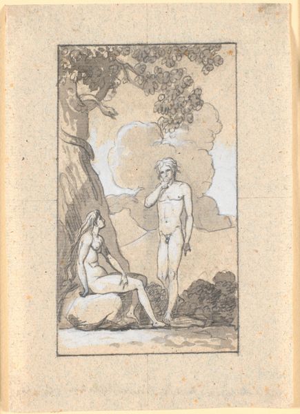 Curator: We’re standing before Nicolai Abildgaard’s “Den nyskabte Eva,” or “The Newly Created Eve,” made around 1777 to 1780. It’s rendered in pencil, watercolor, and coloured pencil, all on paper. Editor: Immediately, I'm struck by the seeming roughness of it. It looks less like a finished artwork and more like a preparatory sketch. I'm interested in what was on his mind, materially, while composing this. Curator: Given its origins in Romanticism, consider the emotional weight being carried here, through visual symbolism and the continuity of the Edenic myth! Eve's upward reach suggests an immediate spiritual yearning, that moment of becoming. And notice the light illuminating her form… she's almost literally touched by grace, you see it in the Romantic striving after sublime emotional experience. Editor: Right, and looking at the work’s materiality complicates this notion of spiritual yearning, though. See how the strokes of pencil and watercolour create a body, yes, but one firmly rooted in its making. The lines are not particularly polished or hidden – the "grace" feels like a construction from these very earthly materials. There's an intentional lack of finish that reveals the artist's hand, drawing our attention to labor. Curator: It is also a figuration, so of course there is an artifice in its making, we see a familiar, re-worked narrative being told, where symbolic resonance carries cultural weight. Abildgaard engages directly with that long lineage of Eve imagery and history. This is about Paradise Lost being rendered and imagined for an emerging Denmark. Editor: That's exactly it. He's handling pencil and watercolor, available materials, making marks that perform the familiar story you described. The materiality asks us to consider art as both product and production, and reflect upon the labor to reinforce it, maybe to create and sell national mythologies, like "Danish Romanticism." Curator: And beyond simple 'production', what is produced, Editor, is the very *idea* of Danish Romanticism – a distinct emotional and intellectual landscape painted onto the broader canvas of European thought. Editor: That emphasis also reflects Romanticism; a material approach lets us grasp its creation. Seeing the watercolor bleed and the pencil lines scratch brings us closer to understanding not just the divine narrative but also the terrestrial work required to construct it. Curator: Quite so. The creation is never without its material roots. Thank you, Editor! Editor: Thanks, Curator. Always good to delve deeper than what’s on the surface.