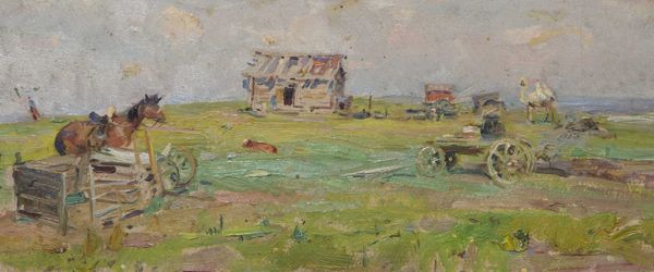 Editor: This is "Pejzaż wiosenny," or "Spring Landscape," painted by Tadeusz Makowski sometime between 1920 and 1921, rendered in watercolor, perhaps en plein air. It has this incredibly light and airy feel to it. What do you make of it? Curator: Focusing on its intrinsic elements, one immediately notices Makowski’s command of light and color. The subtle gradations in hue, particularly in the rendering of the sky and foliage, speak to an Impressionistic sensibility. Observe how the brushstrokes, applied with a delicate impasto technique, create a vibrant surface texture. Editor: Impasto? You mean the thickness of the paint? It seems very delicate here... Curator: Precisely. It is not the heavy impasto of, say, Van Gogh, but rather a restrained application that enhances the luminosity. How does the composition—the arrangement of the architectural forms and natural elements—contribute to your perception of the work? Editor: I find it almost dreamlike. The building is grounded by a few strong shapes, but the blossom almost blends into the air... Curator: Indeed. The semiotic reading of these shapes and their interplay reveals a dialogue between solidity and ethereality. The stable architecture contrasts with the fleeting nature of the blossoms, symbolizing the transient beauty of spring. Consider how Makowski employs this dialectic to convey a sense of time and change. What’s your perspective on the overall mood? Editor: It’s optimistic, somehow both delicate and strong. I hadn’t considered how the contrast was part of that feeling. Curator: The analysis of the elements creates, for me, a renewed appreciation for the artist's structural skill and expressive abilities. Editor: I can now better see the elements interacting. Thanks for the lesson in looking beyond the surface!
