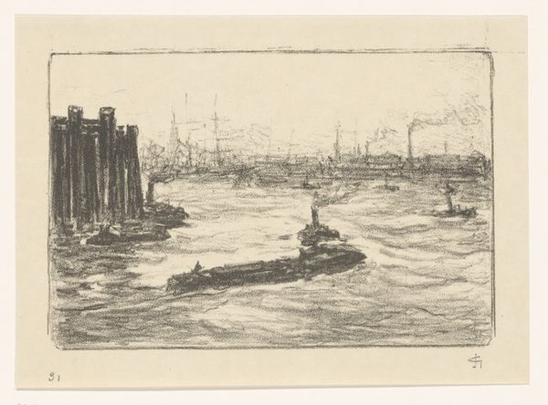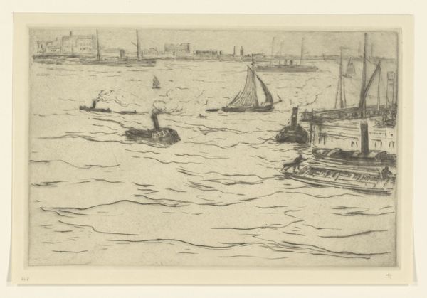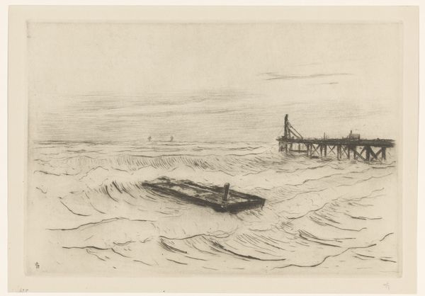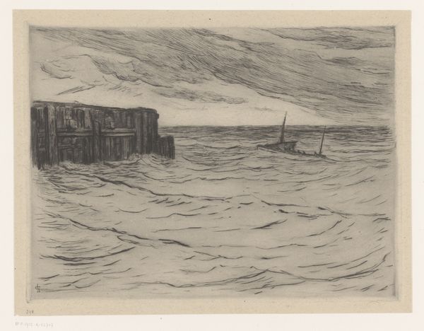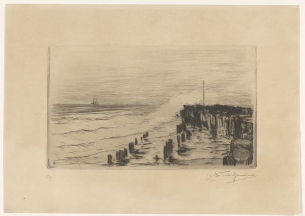 Curator: Looking at this etching titled "Zeegezicht met golfbrekers bij Vlissingen," made by Carel Nicolaas Storm van 's-Gravesande between 1889 and 1902, I immediately feel a strong sense of starkness. Editor: Yes, there’s a somber quality, isn’t there? The limited tonal range really accentuates the play of light on the water, lending it a slightly melancholy mood. For me, the focus on Vlissingen also grounds it firmly in its geopolitical context; it reminds us of the reliance on maritime activity that marked so much of the Netherlands' history. Curator: Absolutely. And consider the visual vocabulary here. The sharp, angular lines used to depict the breakers, coupled with the relatively simple shapes defining the ships on the horizon, really guide the viewer's eye, don't they? Editor: They do. Storm van 's-Gravesande highlights humanity's vulnerability against the vast power of the sea. It's not merely a neutral portrayal, but it brings the ecological, social and economic circumstances together to create the total representation. Fishing and trading were very precarious ways of life in the era due to overfishing and unsafe vessels, not to mention its reliance on other empires who took advantage of native resources, so the artist also presents us with the class structure of the Dutch sea. Curator: I agree. There is the feeling that humanity is almost swallowed by nature in the piece, but look closely and you can see its mastery as well. The printmaking technique allows him to capture incredible detail within a constrained grayscale. But do you see the cultural elements here? Are you assuming, because the etching uses a realism art style, it fully encompasses every social condition for that timeframe? I think to call this commentary, not an exploration of line and perspective is the real claim to defend here. Editor: I'm more intrigued now than before, which means it was effective in some sense. Curator: And the light reflecting and refracting and the overall attention to geometric forms allows me to further contemplate on visual storytelling!