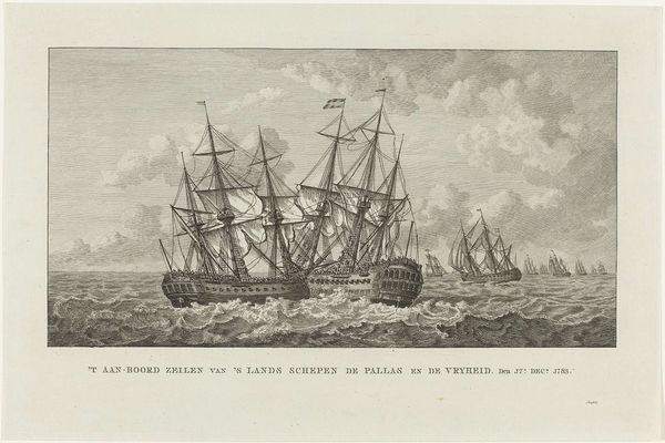 Curator: This engraving by Cornelis van Noorde, dating from around 1769 to 1770, is titled "Four Greenland Ships Trapped in Ice." Editor: It has a distinct feeling of desolation. The ships, these huge structures, are rendered helpless amidst the stark white landscape. There is something menacing about the imposing whiteness surrounding the scene. Curator: Indeed. Van Noorde’s mastery of line creates a sense of depth. The arrangement of the ships, receding into the distance, establishes a clear spatial relationship. Also, the precise, almost scientific rendering, reminds us of the Enlightenment’s focus on observation. Editor: Yet, looking at those details--the straining polar bears and the seal among ice floes—one cannot ignore the brutal realities of 18th-century colonial expansion. These expeditions decimated indigenous populations and disrupted fragile Arctic ecosystems. Curator: The animals underscore the perilous environment and also demonstrate the ecosystem coexisting with, yet now threatened by, the intrusion of human endeavor. The use of line conveys a tactile sense of coldness. The variations and density within this visual vocabulary articulate the scene in a powerful way. Editor: Quite right, it's also crucial to recognize that what might read as “precise observation” to us, also facilitated resource extraction and territorial claims. The history of art must take into account these power dynamics if we are to avoid celebratory framings of such works. The engraving thus presents not only a moment in time but also opens conversations about ethical practice and responsible environmental interaction, past and present. Curator: Your reading complicates our perception. In analyzing it, my attention focuses on its aesthetic and formal achievements; its organization, light, shadow, and texture within the representational system it creates. Editor: As we conclude, it is the tension between the artist’s representation and our contemporary values that gives the image its lasting charge, making us more acutely aware of the intertwined legacies of colonialism and environmental exploitation.