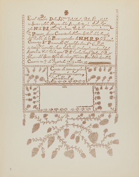 Curator: This drawing by Carel Adolph Lion Cachet is an ornamental page from around 1899, titled "Inleiding met ornamentrand voor Onder Neerlands vlag." The design consists of text framed by decorative, stylized plant motifs, executed in ink on paper. The work, now at the Rijksmuseum, shows characteristics of the Art Nouveau movement. What's your immediate take? Editor: Well, the immediate feeling is somber, almost militant. The sharp contrast of the black ink against the white paper lends a sense of austerity, which aligns somewhat with the bold typography. Curator: Yes, that’s an astute observation about the formal elements. Look closely at how the typeface and floral patterns contribute to the artwork’s overall structure. The strong verticality and the rhythmic repetition of the design elements suggest a structured visual system, almost like a grid. The letterforms themselves feature unique attributes rooted in early-20th-century design. Editor: The context here is unavoidable though. Considering this was created at the turn of the century in Europe, a period of intense nationalism, doesn't the title "Under Netherlands Flag" together with this kind of severe presentation feel like a visual representation of Dutch militarism or colonial ambitions? The typography even carries a slight martial tone. It reads as nationalistic propaganda cloaked in Art Nouveau aesthetics. Curator: I agree that it evokes powerful historical and social connotations, although this work’s emphasis on formal qualities might point away from overly blatant ideological aims. But that tension itself is precisely what's fascinating. The interplay between these organic, stylized shapes and the regimented text creates a striking duality, a push-and-pull effect where the decorative elements attempt to soften the inherent rigidness of the printed word, though ultimately failing. Editor: Ultimately failing, I agree. Still, consider how it functions as a historical object: who was this created for? How did its intended audience interpret these symbols of the Dutch flag in relation to their experiences? Those questions lead toward richer narratives of identity and power dynamics. It provides insight into the visual strategies through which national pride and perhaps even cultural dominance were communicated at the time. Curator: A well-taken point. Examining the work through an ideological lens indeed opens exciting avenues of interpretation. What strikes me as relevant, from a purely formal point of view, is the use of this graphic art aesthetic and format to give prominence and embellishment to words; indeed the word becomes art, which is very much the focus here. Editor: I think considering both these frameworks reveals an enduring testament to art's capability of embodying complex ideas—or perhaps even serving a social or political cause!