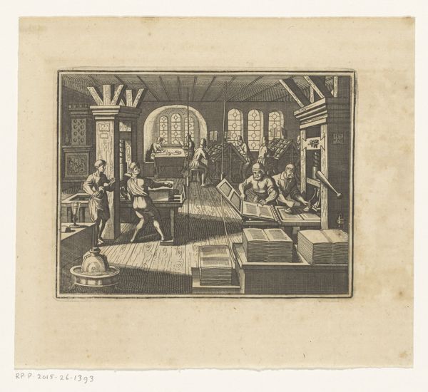 This is a photographic reproduction of Johannes Jelgerhuis's depiction of Pieter Meijer Warnars's bookstore in Amsterdam. The sepia tones evoke a sense of historical distance, yet the image's formal structure draws us into the space. Note how the composition uses linear perspective to create depth, leading the eye from the foreground, where figures engage in commerce, to the brightly lit doorway at the back. The shelves of books, rendered in precise detail, dominate the left side, creating a sense of enclosure and intellectual density. The architecture, with its high ceilings and ornate friezes, adds to the impression of a space dedicated to knowledge and culture. The stark contrast between the interior and the bright outdoor scene visible through the doorway invites us to consider the relationship between the world of books and the world outside. This contrast reinforces the bookstore as a threshold between different realms of experience, inviting contemplation on the nature of knowledge itself.