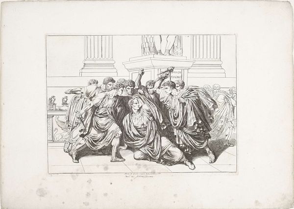 Editor: Here we have Bartolomeo Pinelli's "The Rape of the Sabine Women," an engraving and etching from 1816. The scene is chaotic and unsettling; men seem to be abducting women in what looks like ancient Rome. What stands out to you in this work? Curator: Indeed. This piece offers us a window into how the past was interpreted – and, in a sense, justified – in the 19th century through a Neoclassical lens. Pinelli chooses to depict a foundational myth of Rome, but what does it mean to represent abduction as a heroic act? The ‘Rape of the Sabine Women’ has long been a subject in art history, so let’s consider what happens when the focus shifts from the trauma experienced by these women to the supposed glory of Rome. How does that impact our understanding? Editor: It’s troubling to think about it that way. It’s easy to get caught up in the classical aesthetic and the details of the scene, but framing it as glorifying violence against women definitely complicates things. Curator: Precisely! We must confront the unsettling elements. Neoclassicism often draws upon historical narratives to make contemporary political statements. How might this image be commenting on power, dominance, and even colonial ambitions of Pinelli's time? Can we consider it a form of cultural appropriation or justification for imperial expansion, masked in historical guise? Editor: That’s a lot to consider. I hadn't thought about it beyond just a historical depiction. Curator: By exploring these uncomfortable questions, we start to uncover the deeper ideological work this image is doing. It forces us to think critically about the relationship between art, power, and the stories we choose to tell about our past and our present. Editor: I’ll definitely look at similar historical paintings with a more critical eye moving forward, considering the power dynamics that are portrayed.