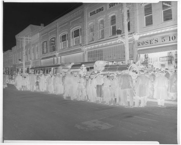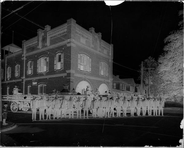 Editor: This photograph by Martin Schweig, titled "Untitled (two men in caps carrying floral arrangement down walkway lined with men in military uniforms)," really captures a formal, yet somber, scene. All these uniformed figures... what’s your take on this image? Curator: Well, viewing it through a historical lens, consider the socio-political context. Military imagery, especially in public, always carries a certain weight. Whose narrative is being presented here and for what purpose? The floral arrangement, juxtaposed with the military presence, suggests a public ceremony, perhaps commemorating a specific event or loss. It prompts us to consider the role of art in shaping collective memory and national identity. What do you think the public response might have been at the time? Editor: That's fascinating. I hadn't considered the possible public reaction. Thanks!